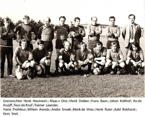 Zittend v.l.n.r.: K.Snel, M.Gerrits, S.Krijgsman, J.Drost, J.de Haan, G.Hoogland, W.Boom, G.v.d.Belt, H.v.'t Klooster, A.Snoek, F.de Smalen, J.Kolthof, J.v.d.Kooi, J.Hoogland, G.Osnabrugge