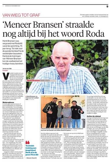 Henk Bransen was vergroeid met Roda'46 vanaf de oprichting, 75 jaar terug. Tot vlak voor de pandemie bleef hij de wedstrijden bezoeken. Dankzij de trainingen van 'Meneer Bransen' kon de voetbalclub het huidige niveau bereiken.
