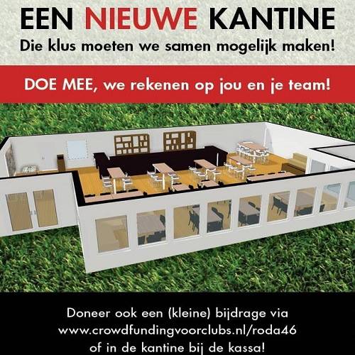 Iedereen ziet de noodzaak in om deze verbouwing uit te voeren. En dat deze dit veel geld kost mag duidelijk. De steun van AFAS Software is daarin onmisbaar. Maar daarmee zijn we er nog niet! Ik wil dan ook iedereen vragen om middels het crowdfunding project een financieel steentje bij te dragen. De opbrengst valt eerlijk gezegd nog wat tegen tot op heden, dat moeten we als club met elkaar toch beter kunnen doen? Bezoek daarom nu de website www.crowdfundingvoorclubs.nl/roda46 voor de mogelijkheden!