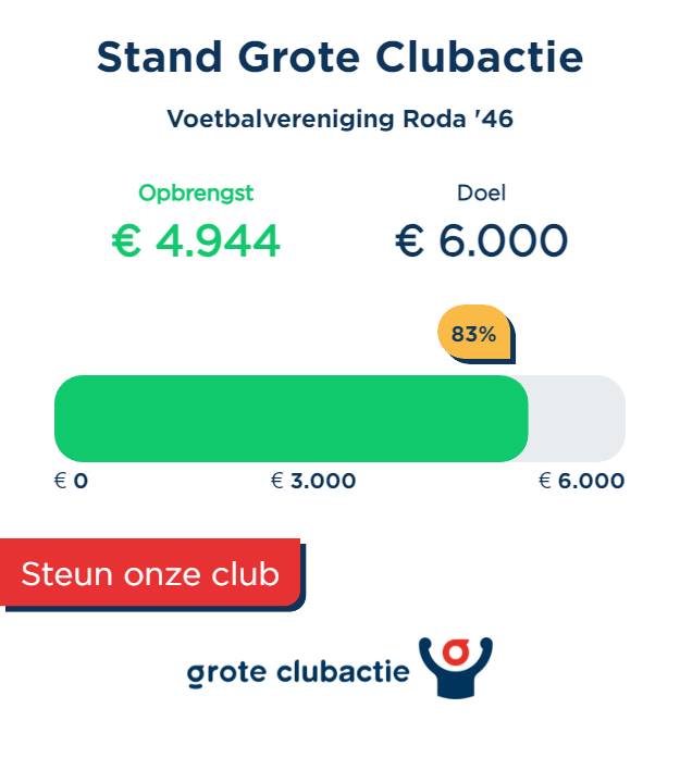 Jullie doen ongelooflijk goed je best om ons doel te halen. Inmiddels hebben jullie bijna 5.000 euro verdiend voor onze club. Nog iets meer dan 1.000 euro te gaan. Fantastisch. Alvast heel erg bedankt. Probeer nog veel loten voor Roda'46 te verkopen.
