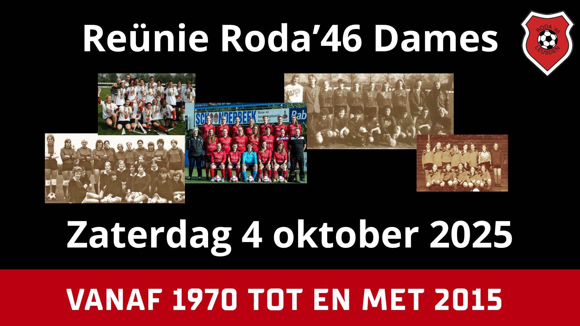 In 1971 werd de damesafdeling van Roda’46 voor de eerste keer opgericht. Helaas stopte dit in 1976 door onvoldoende aanwas.Sinds eind jaren 80 is het damesvoetbal echter niet meer weg te denken bij Roda’46. Na de Reünie van de zaterdag- en zondagafdeling lijkt het ons leuk om ook een Reünie voor de damesafdeling te organiseren die vanaf 1970 tot en met 2015 bij de dames gevoetbald hebben. Ook bestuursleden, trainers en begeleiding uit deze tijd zijn van harte welkom.