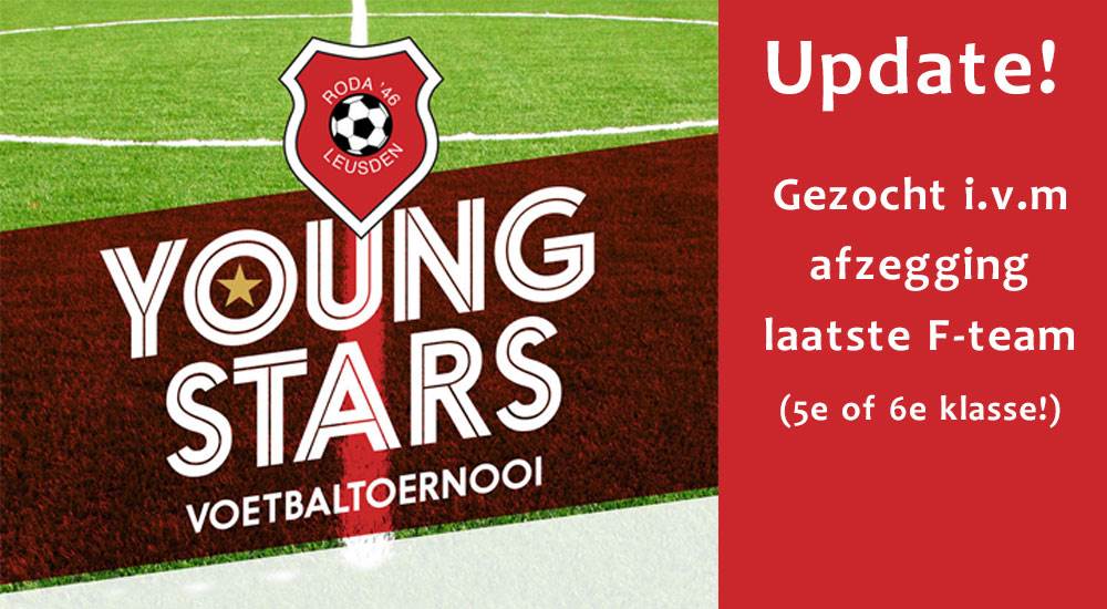Gezocht wegens een afzegging, het laatste F-team (5e of 6e klasse). Meer info en inschrijven via http://www.roda46.nl/links/young-stars/ Zeg en deel het voort!