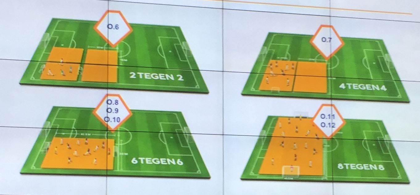 - Onder 6 gaat 2 tegen 2 spelen op 1/8 veldje met kleine doeltjes.