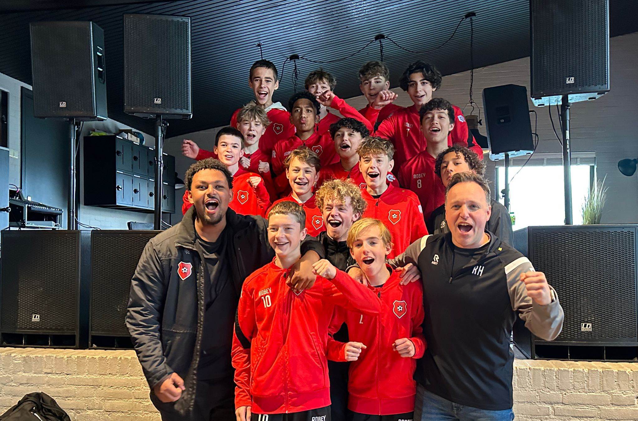 Roda'46 JO15-1 is zaterdag na een spannend slot van de competitie kampioen geworden in de 4e Divisie. Met 2 punten achterstand moest in de laatste speelronde bij koploper SO Soest gewonnen worden. In een spannende wedstrijd won Roda'46 JO15-1 met 0-2, waarna spelers en trainers (Efron Habte Beraki, Remi Huygens, Quinten Riphagen en Bas Verstraete) het kampioenschap en promotie naar de 3e Divisie uitbundig konden vieren.