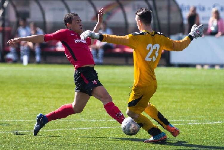 VVZA-doelman Maurice Dam (r) voorkomt dat Mozes Hoppenbrouwer van Roda'46 scoort.