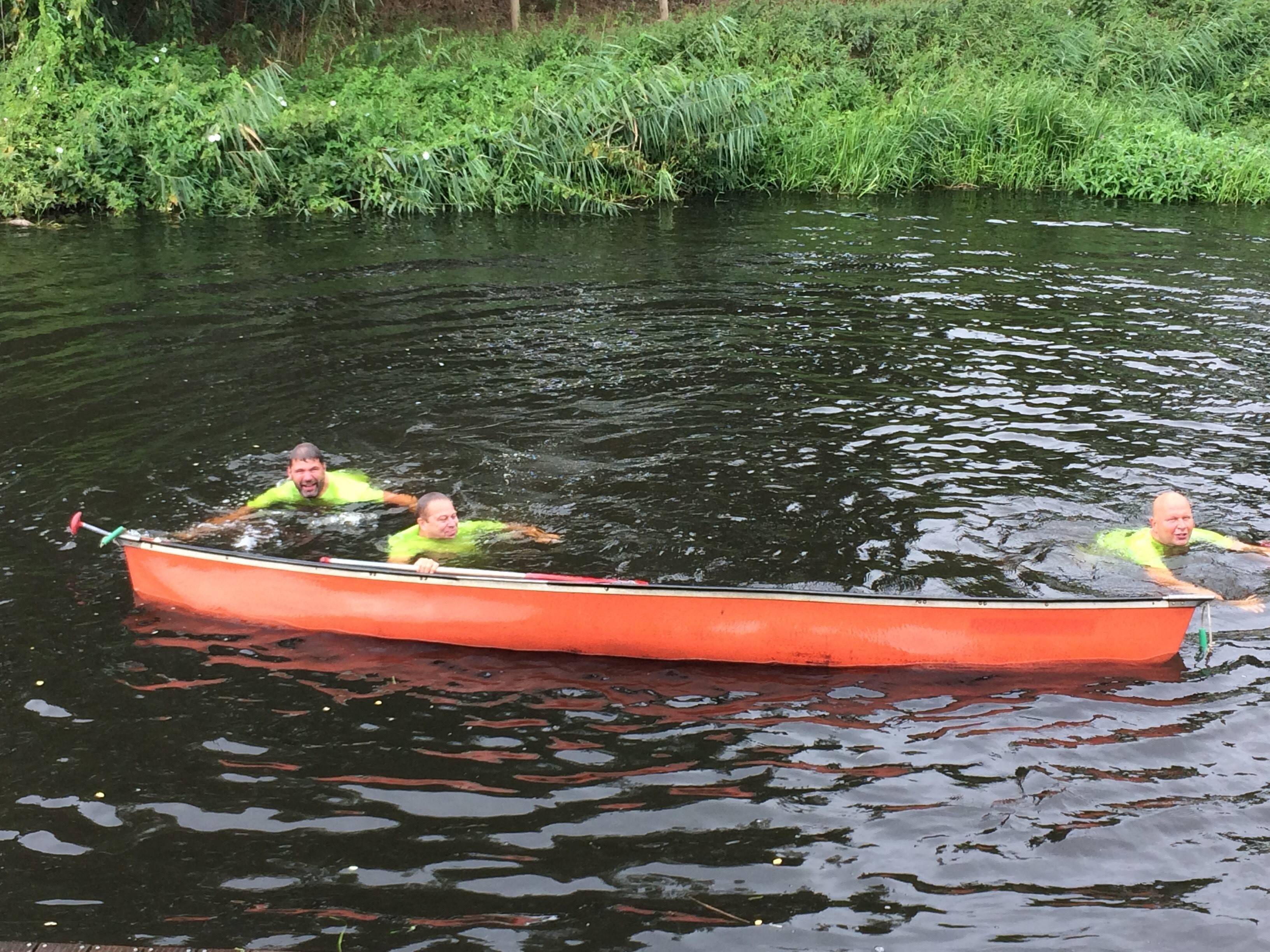 De start was direct prima doordat de boot met onze lichtste deelnemers (Gert, Igor en Jaap) direct na het instappen omsloeg. Het lukte de mannen zelfs om dit te herhalen!! Hierna gingen de mannen op pad en kwamen later op de middag vermoeid terug.